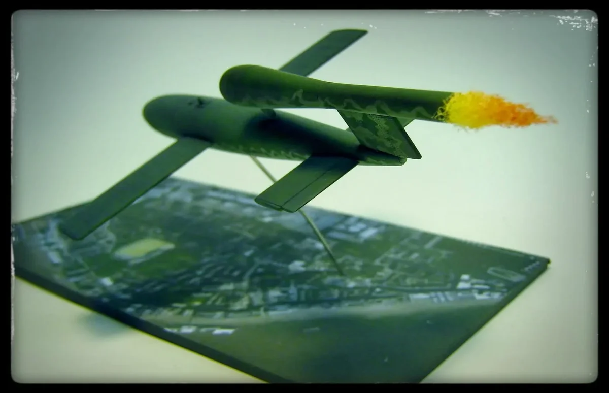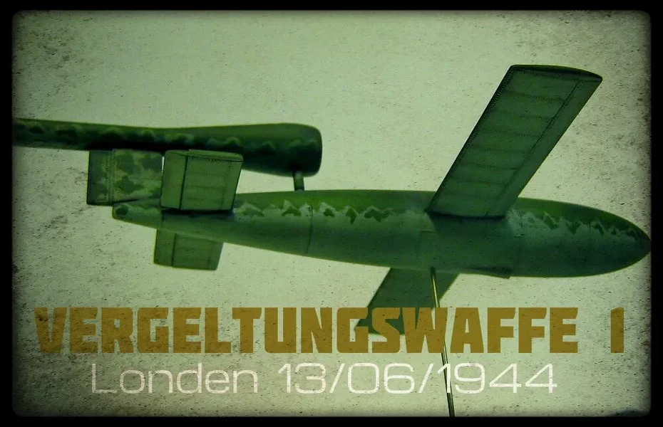 The V1 (also V-1, Vergeltungswaffe 1) was the first German so-called V-weapon of the Second World War and also the first unmanned jet aircraft in the world. It had an explosive charge, making it a 'flying bomb'. It was the predecessor of the later cruise weapons, although these were usually equipped with a rocket engine. In total, more than 30,000 V1s were produced. They were first shot mainly from Northern France and later in the war from the Netherlands. London and Antwerp were severely affected.