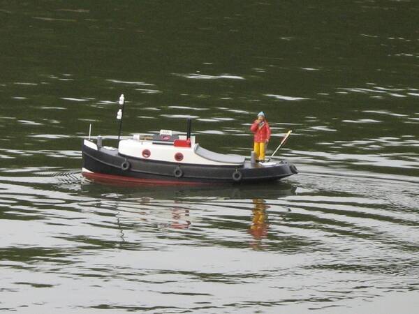 A small pusher with a polyester hull. It does have a propeller tunnel, like most of my boats. It handles very well and is completely waterproof.